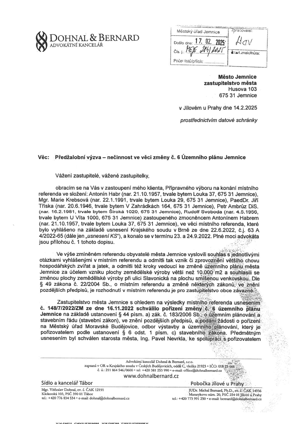 Jemnice obdržela předžalobní výzvu